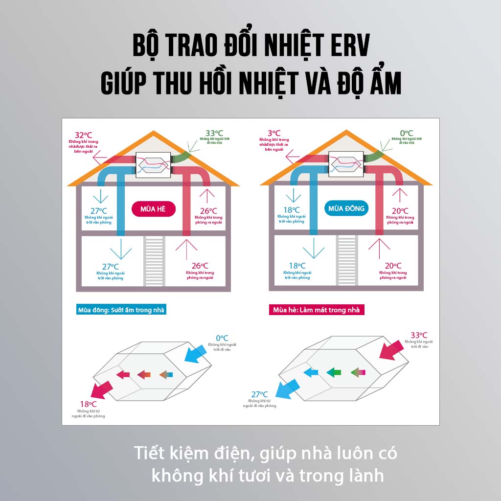 Thu hồi nhiệt ẩm ERV cân bằng nhiệt ẩm trong phòng, giảm tải điện lên điều hoà