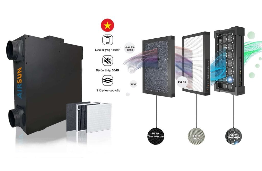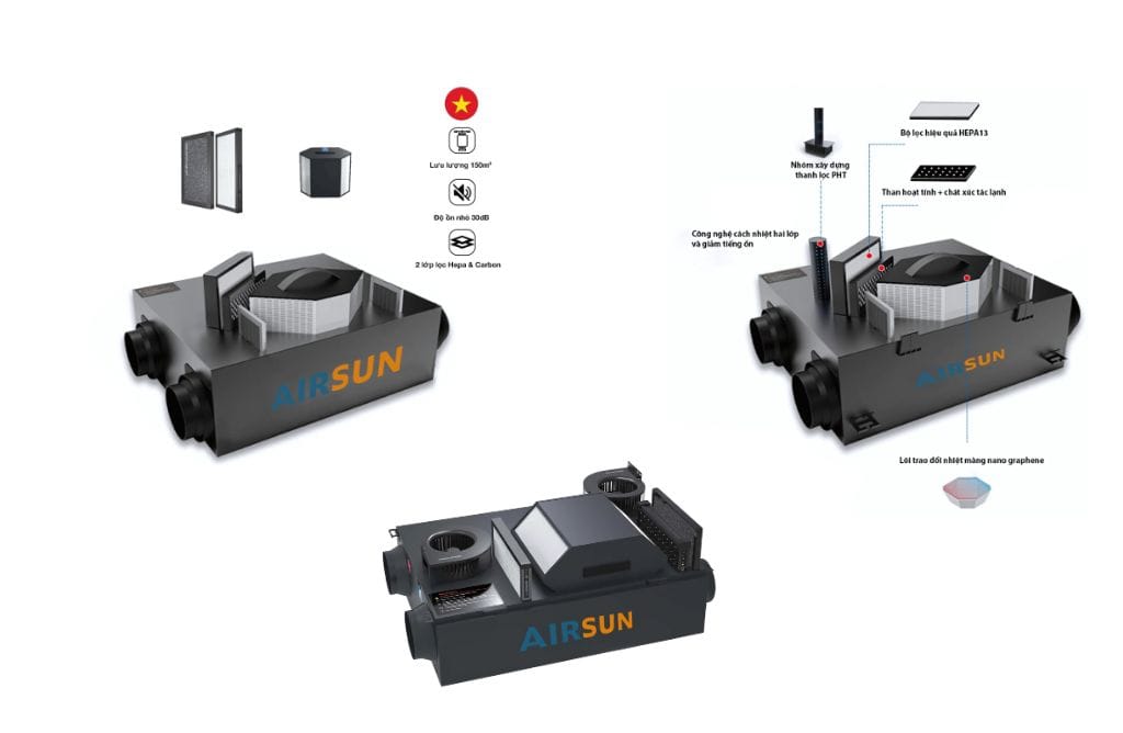 - AirSun AS ERV ESD: Đây là phương án thông gió cưỡng bức cao cấp nhất của AirSun, tích hợp công nghệ lọc tĩnh điện (ESD) cùng G4, HEPA và Carbon. ESD là giải pháp thông gió công nghiệp tối ưu cho các phòng điều hành, phòng lab yêu cầu chất lượng không khí cao nhất, nơi không được phép có bụi siêu mịn, khói hay vi khuẩn.